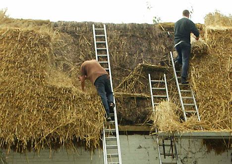 So how does one thatch a cottage? First the thatch is tied in bundles, then laid in an underlayer on the roof beams and pegged in place with rods made of hazel or withy.